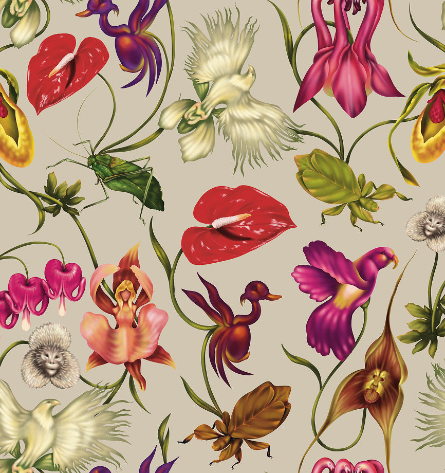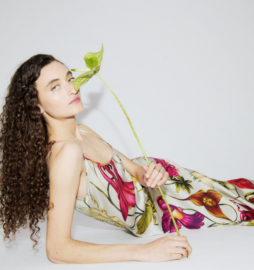 Prints come alive through the 35mm photography of Ros Perrick, whose work captures rare blooms, dead-leaf bugs and orchids mid-dance to the Wonderland print, each piece carries a part of the natural world.